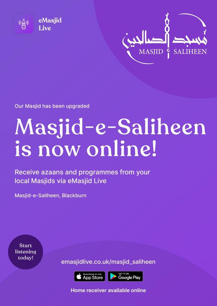 Masjid-e-Saliheen, Blackburn is now live with eMasjid Live.Programmes including Azaans, Bayaans and announcements will be broadcasted via eMasjid Live - whenever the Masjid analog reciever is on, eMasjid Live will also be on insha'Allah.